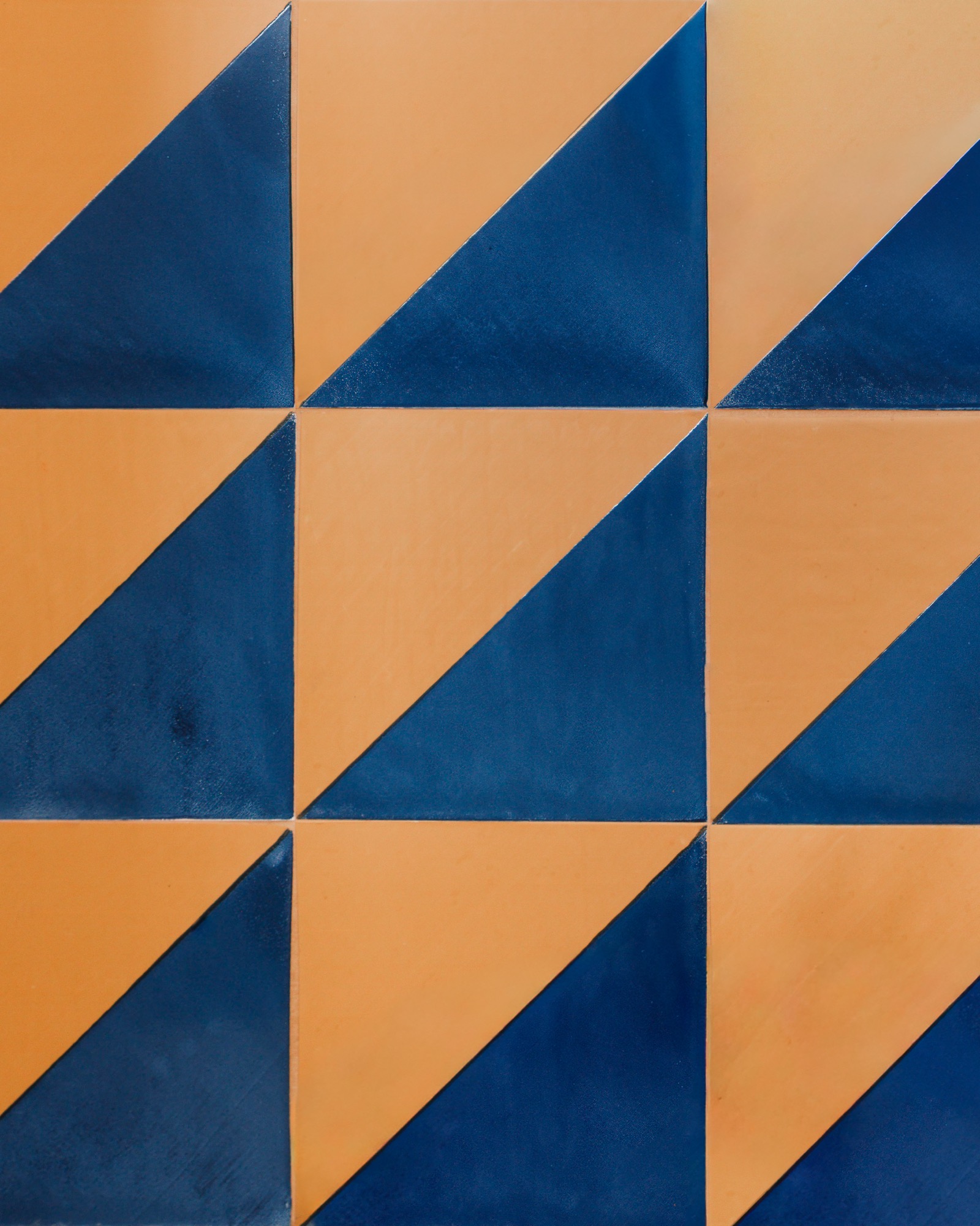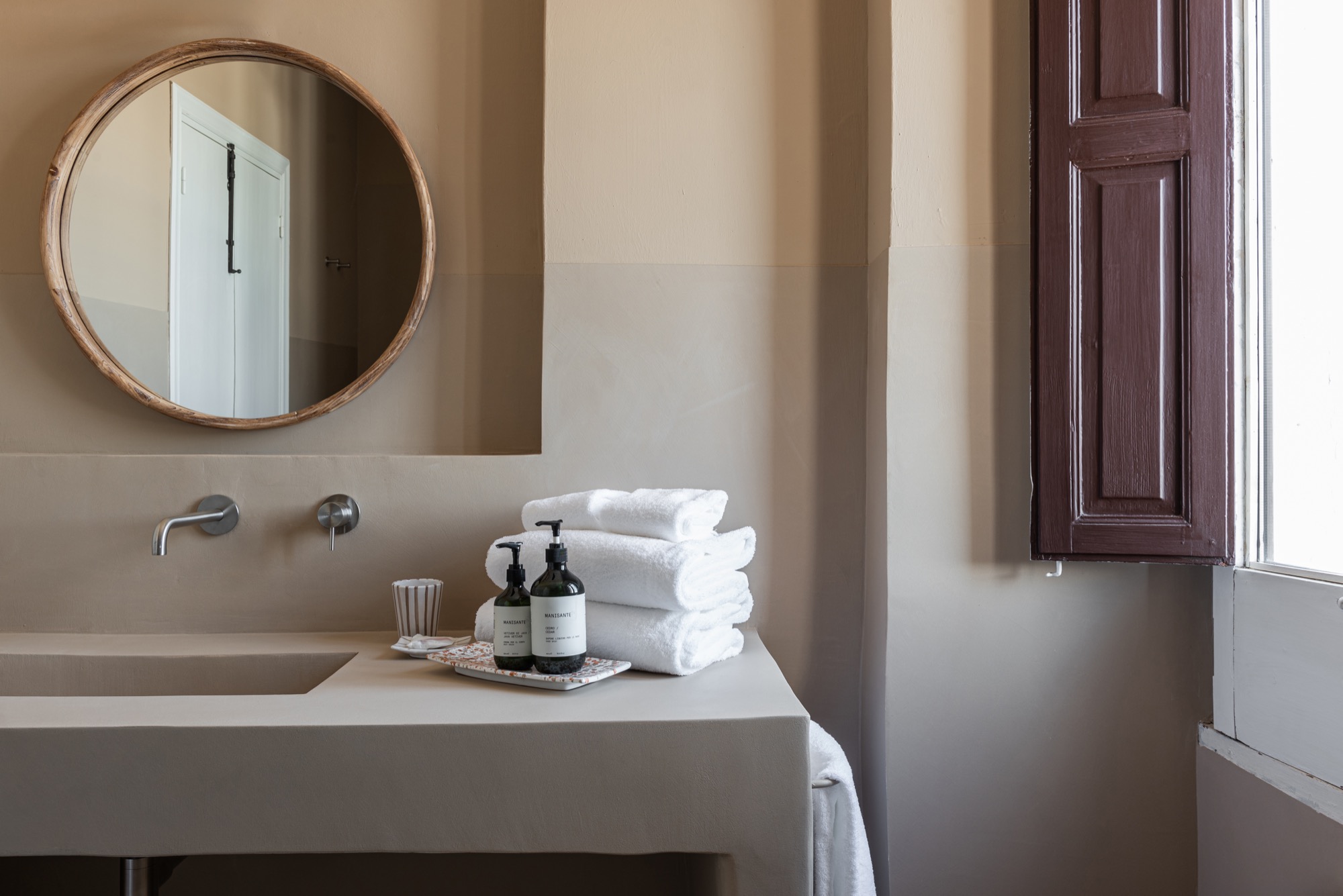 Un pezzo artigianale che porta calore e profondità al colore scelto dalla cliente — il blu, “il colore del suo cuore” — accostato alla tonalità ambra del lavabo Valdama in un gioco preciso di contrasti lucido-opaco. La rubinetteria serie Source di Quadro Design in acciaio spazzolato AISI 316L chiude la composizione, perché ogni dettaglio è curato.