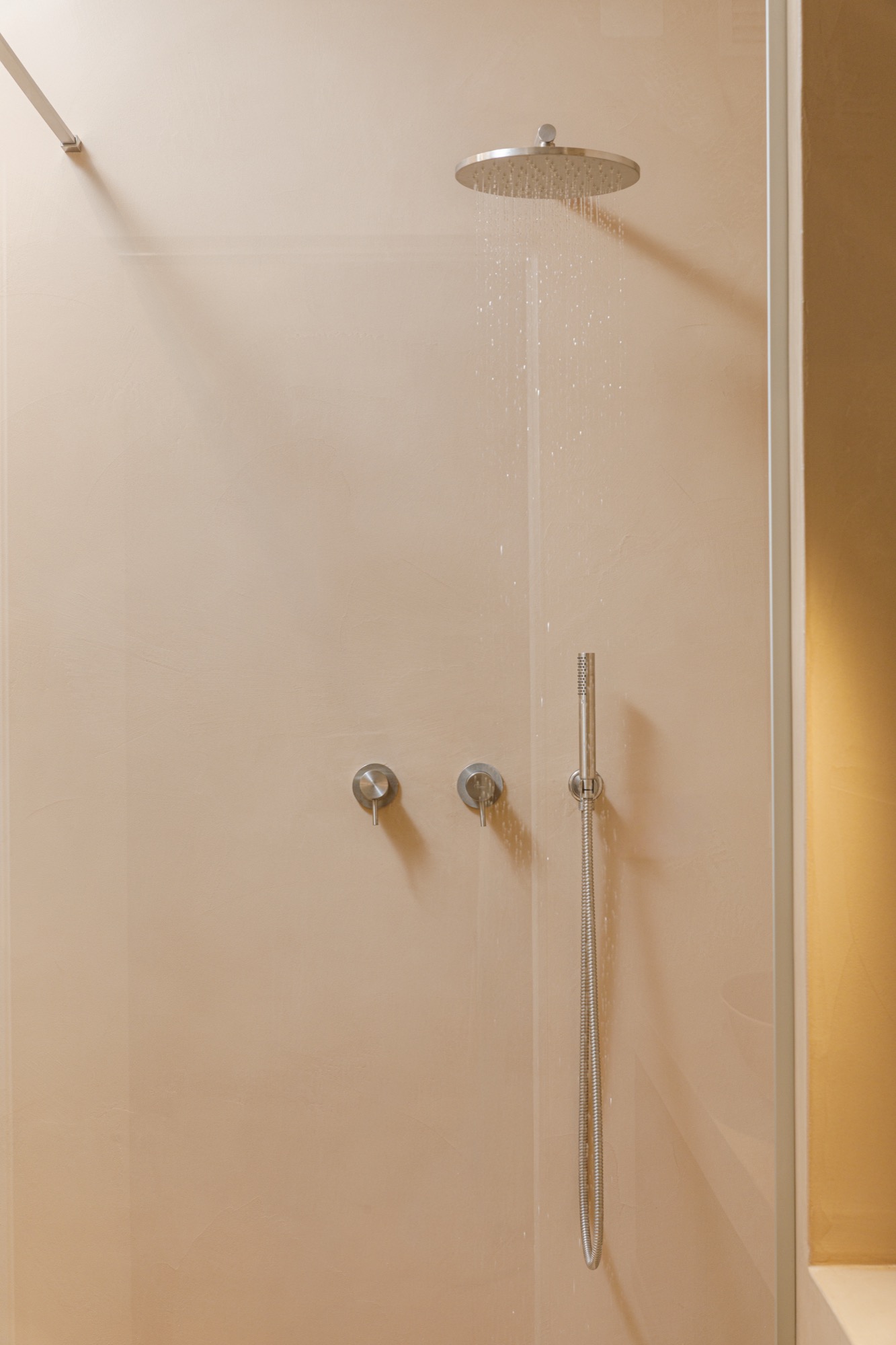In questo bagno, la resina fa da base, il rivestimento custom firmato Ceramica Giovanni De Maio la differenza. Cotto Ogliara 20x20 parzialmente smaltato, con trattamento idrorepellente sulla parte in cotto e luci vietresi lucide su quella smaltata.